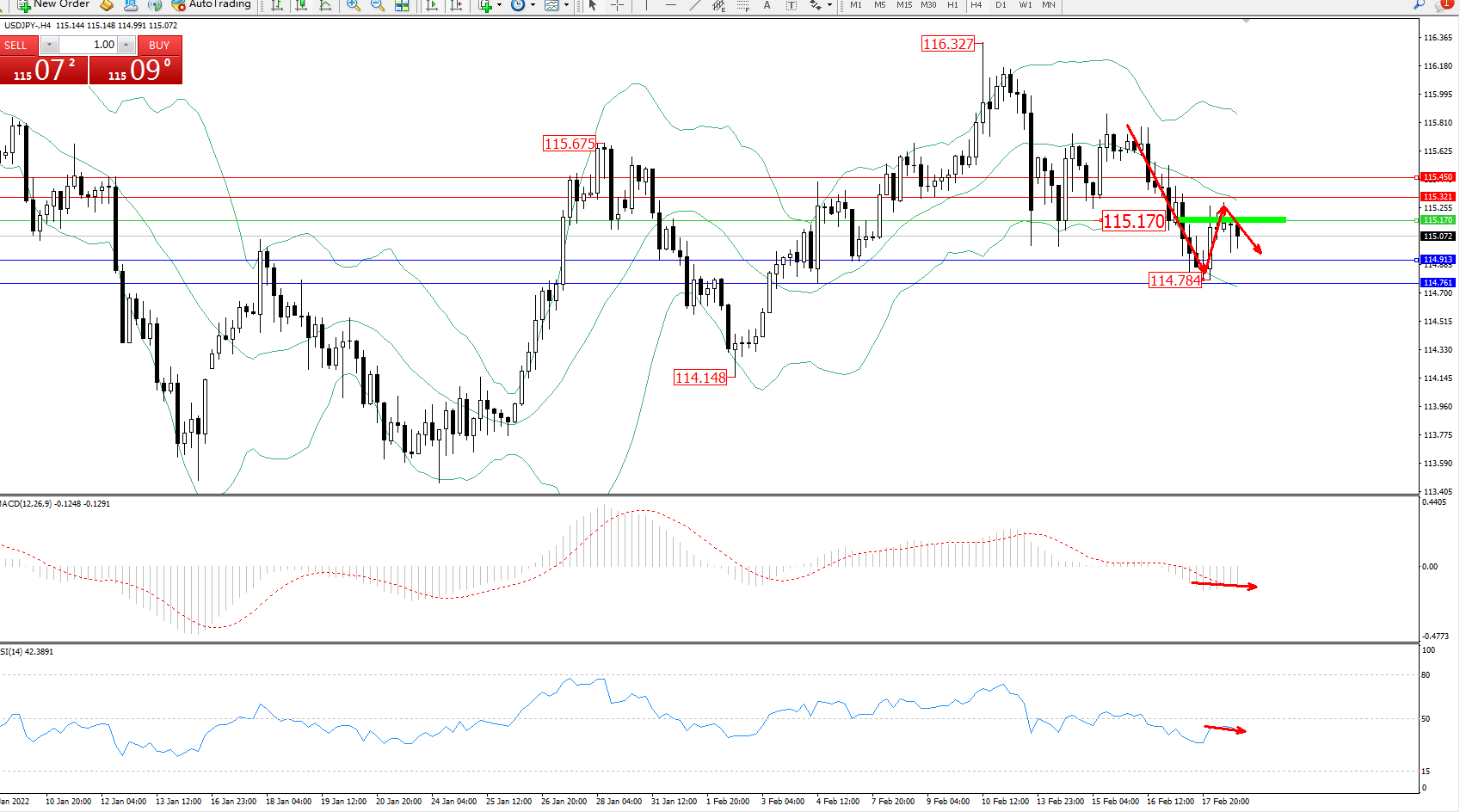 备选策略:115.170上方看涨,目标115.321、115.450