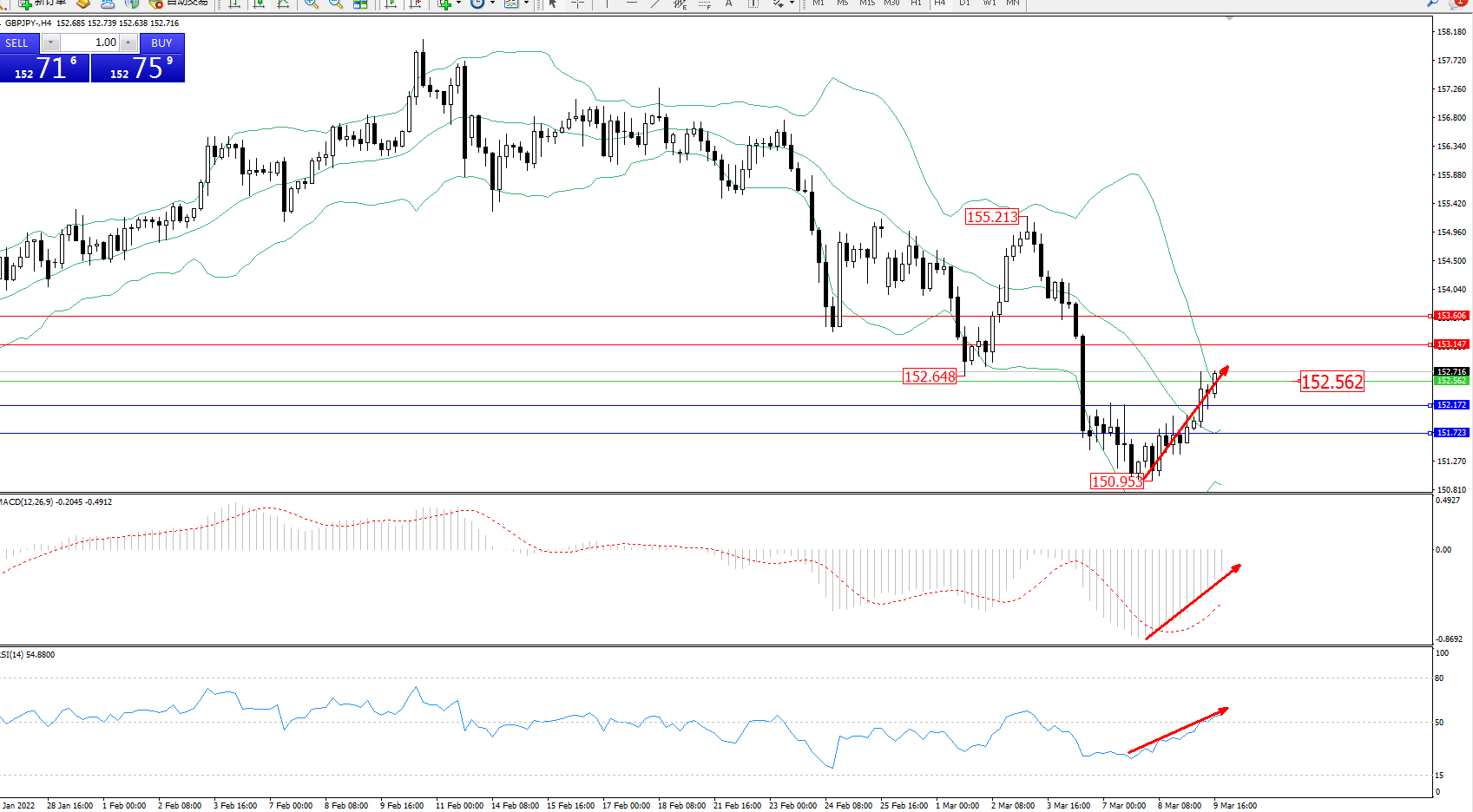 备选策略:152.562下方看跌,目标152.172、151.723