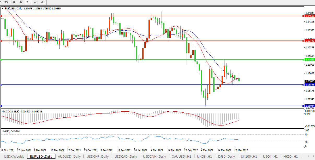 欧元兑美元受伦敦定盘之际的卖盘推动下跌0.1%至1.0984美元,不过投机盘相对温和;欧洲债券收益率下跌,此前德国IFO指数疲软,并且美国和欧盟也宣布了一份天然气供应协议;欧元本周下跌约0.5%。隐含波动率普遍走低;预计下周有执行价1.10美元的大型期权到期。欧元兑瑞郎自3月14日以来首次跌破1.02水平,后反弹至1.0235。
