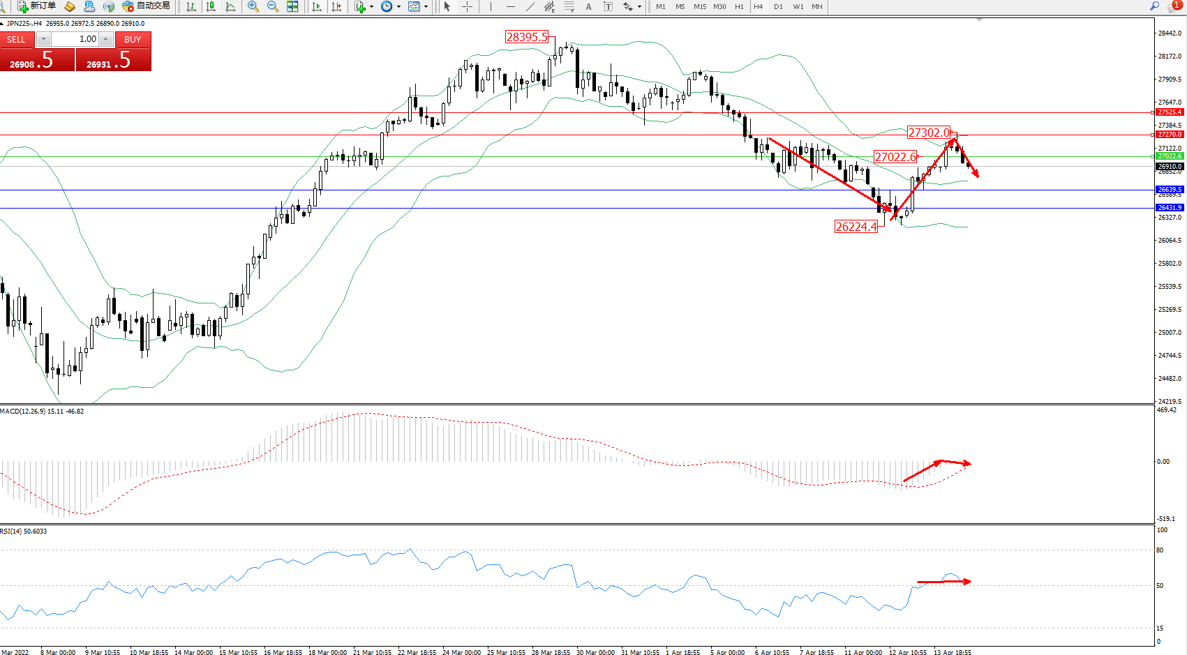 日经指数JPN225——4小时K线图显示: