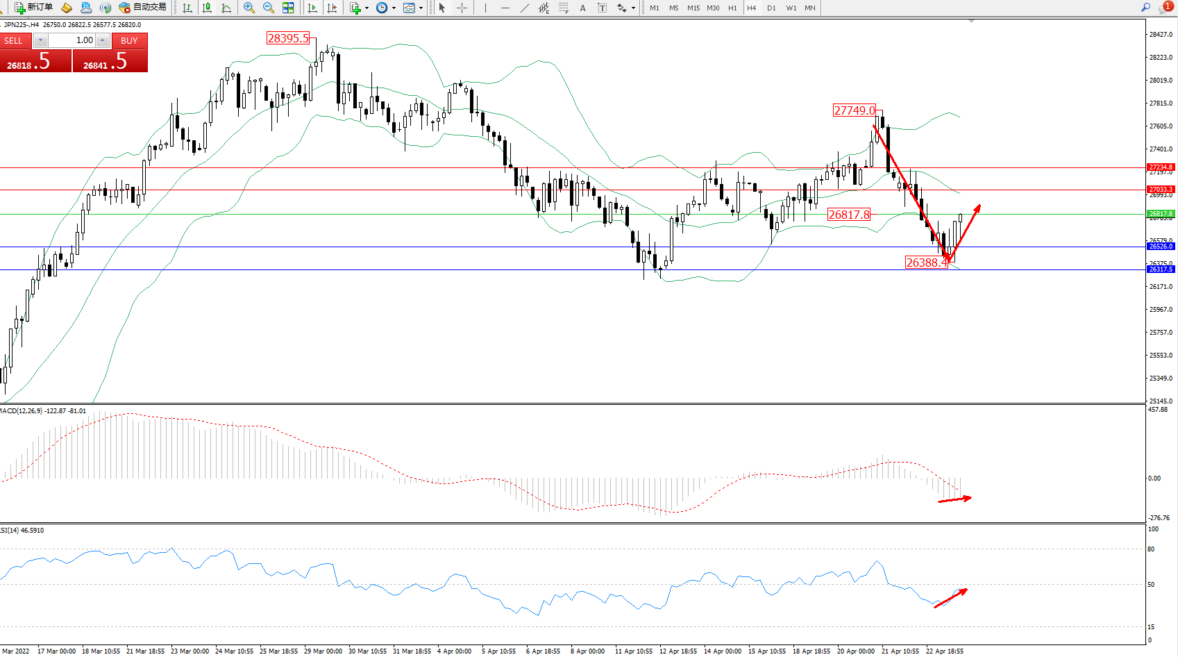 日经指数JPN225——4小时K线图显示: