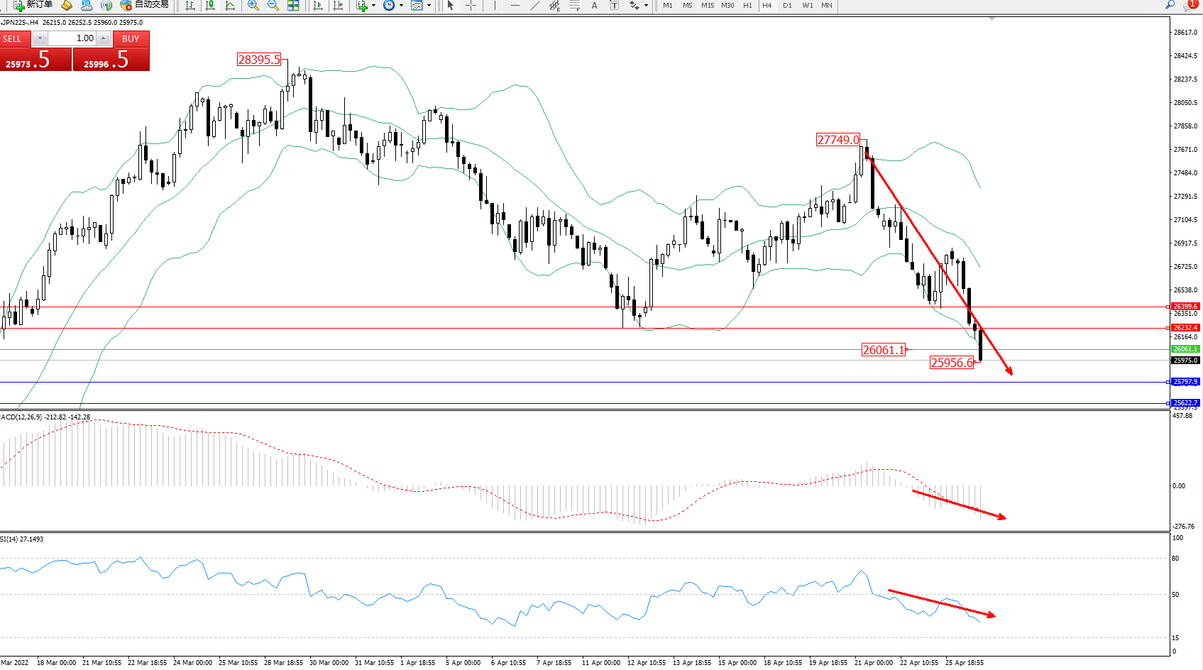 技术点评:空头动力延续布林带指标通道中下轨区间持续震荡下挫,低位抵达25956附近节点后整理,短期空头下行态势良好,且未见有止步迹象,布林带指标呈张口走势后开始收口逐渐向下移动中,MACD指标处于空头区域维持震荡下挫,RSI指标处于空头区域维持震荡不断下移;