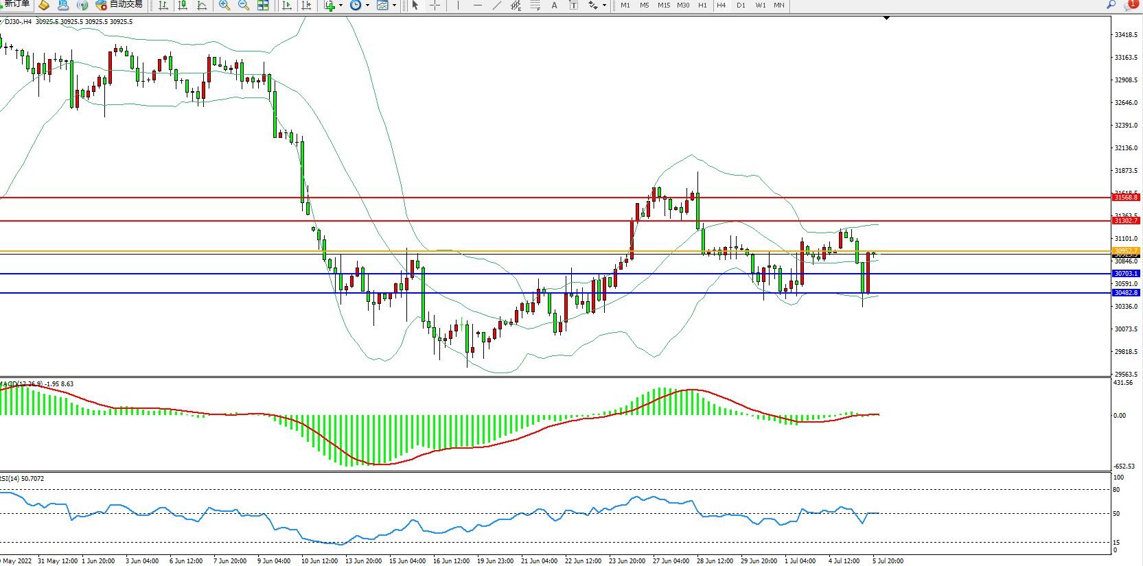道琼斯指数DJ30——4小时K线图显示: