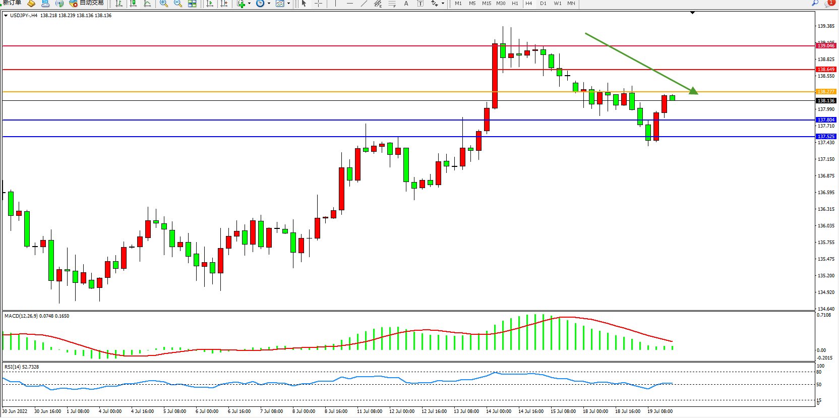 交易策略:138.277下方看跌,目标137.804、137.525