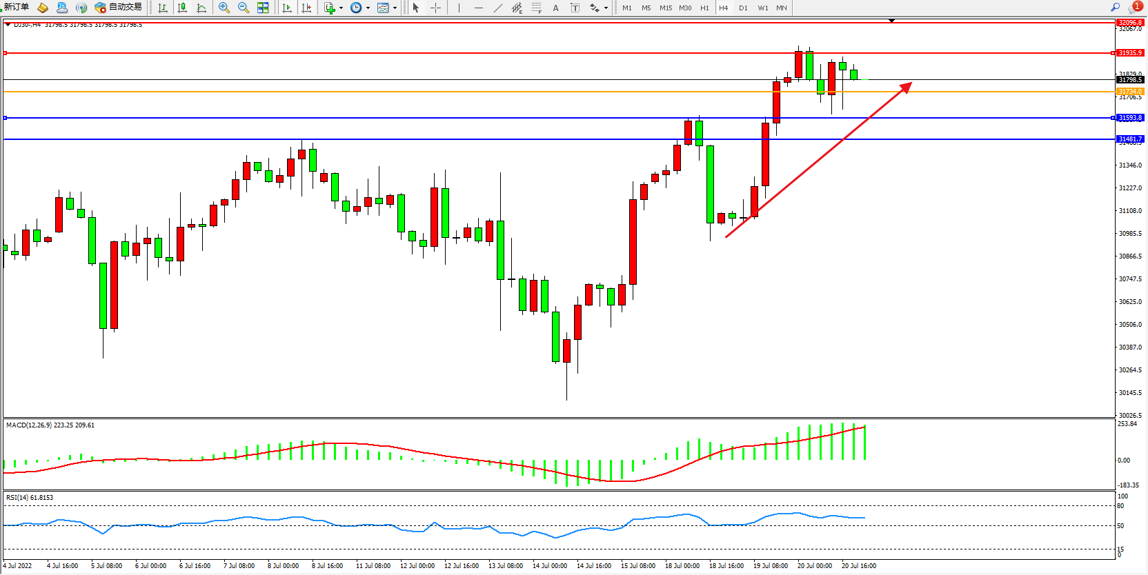 道琼斯指数DJ30——4小时K线图显示: