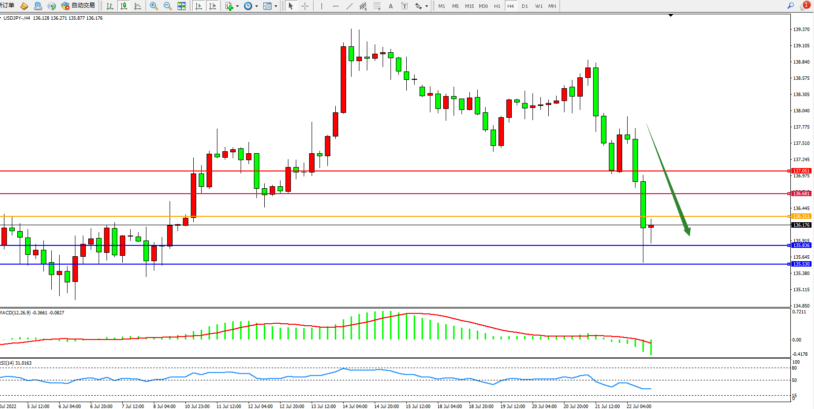 交易策略:136.311下方看跌,目标135.836、135.530