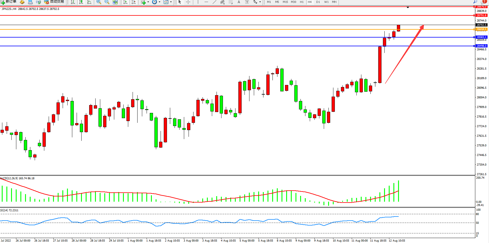 日经指数JPN225——4小时K线图显示: