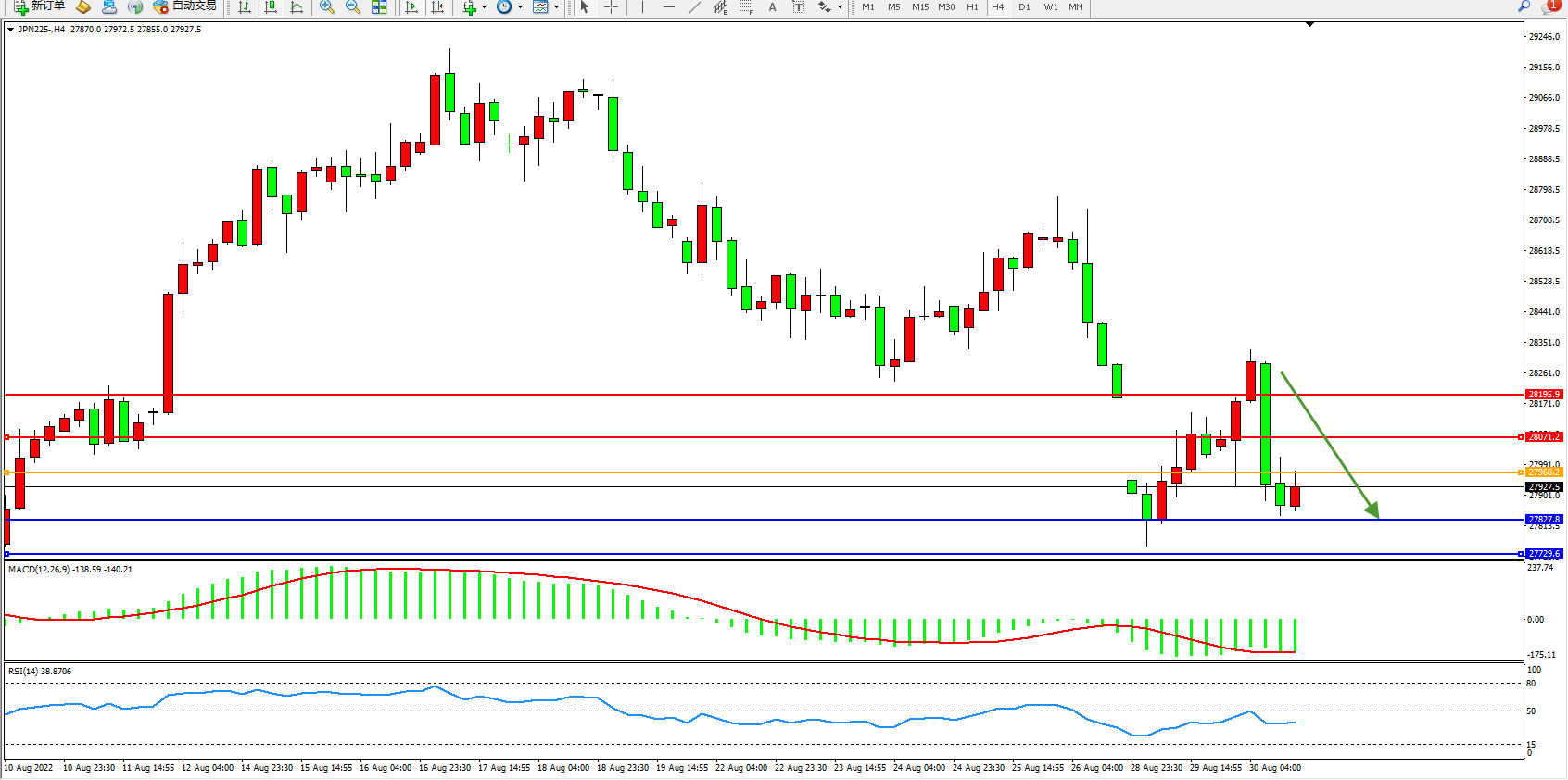 日经指数JPN225——4小时K线图显示: