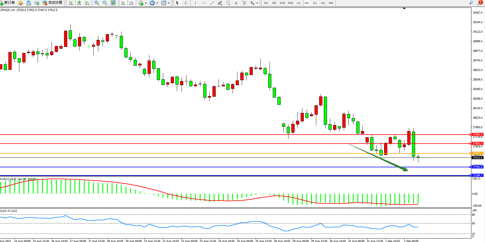 日经指数JPN225——4小时K线图显示:
