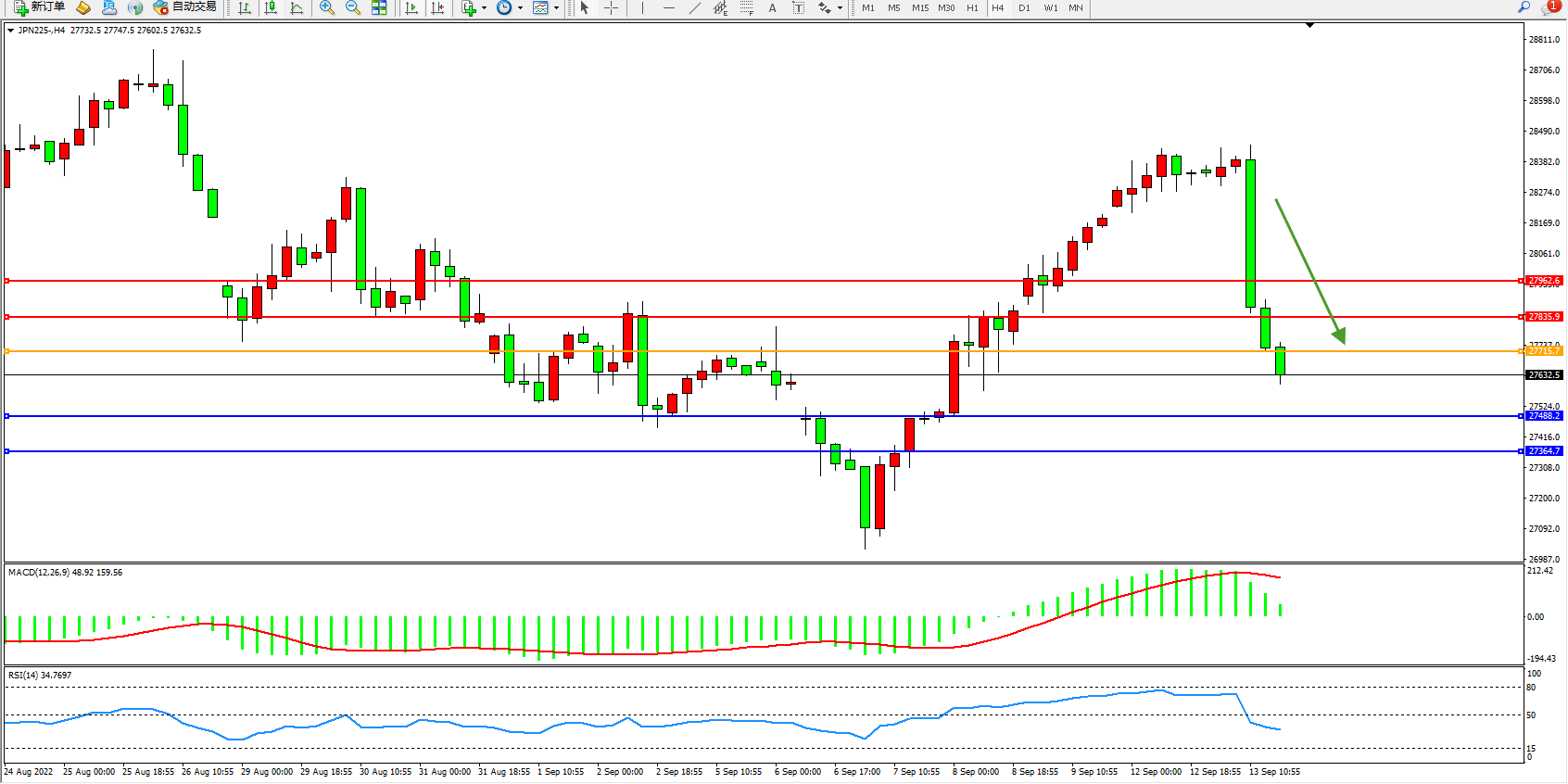 日经指数JPN225——4小时K线图显示: