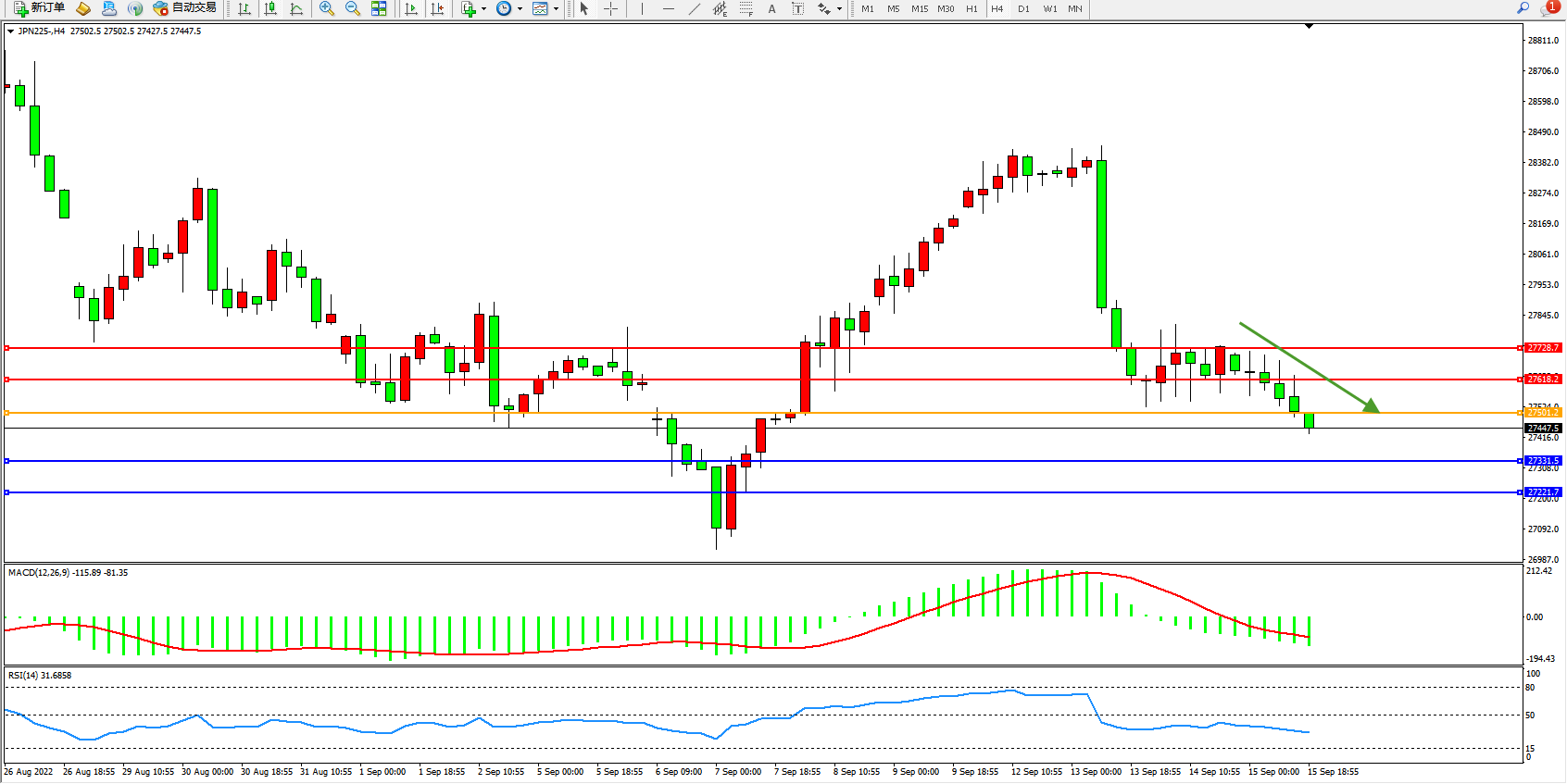 日经指数JPN225——4小时K线图显示: