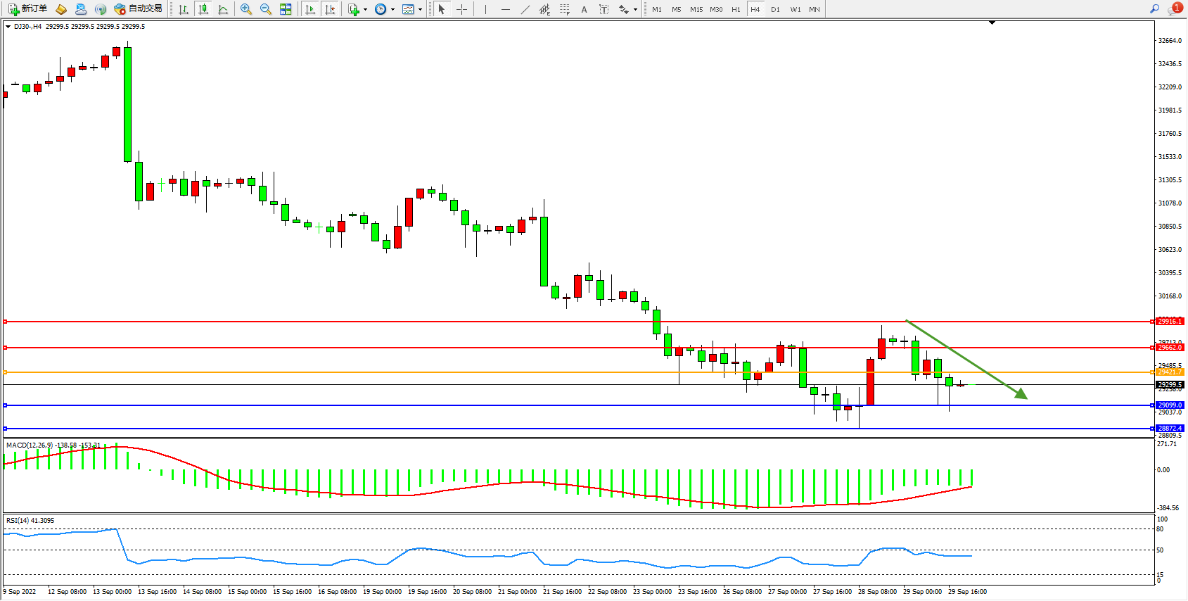 道琼斯指数DJ30——4小时K线图显示: