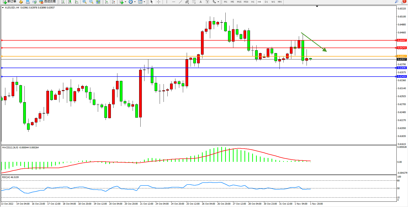 交易策略:0.64012下方看跌,目标0.63696、0.63459