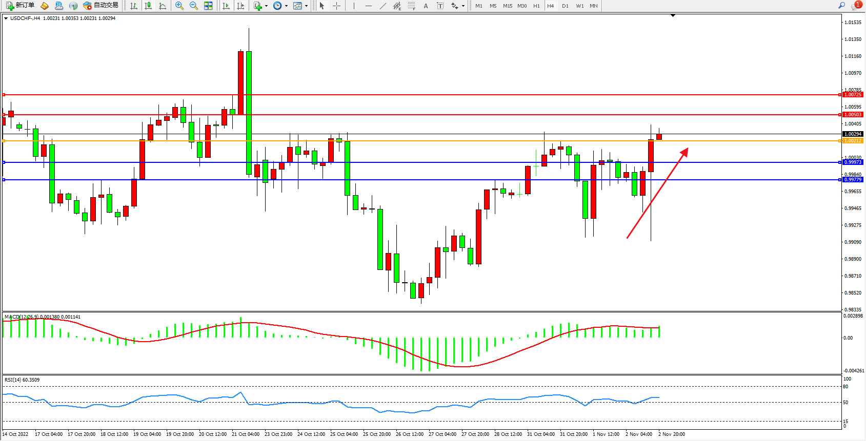 美元兑瑞郎维持1.00294附近震荡,美联储公布最新的11月利率决议,美联储如期升息75基点,至3.75-4.00%,符合预期。预计明年美国通胀率将降至3.5% - 4%,这将给美联储一个暂停加息的“借口”。