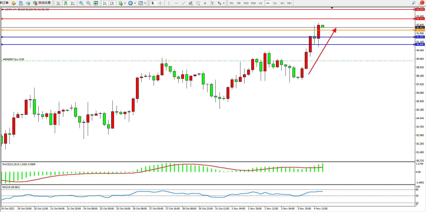 原油USOil——4小时K线图显示: