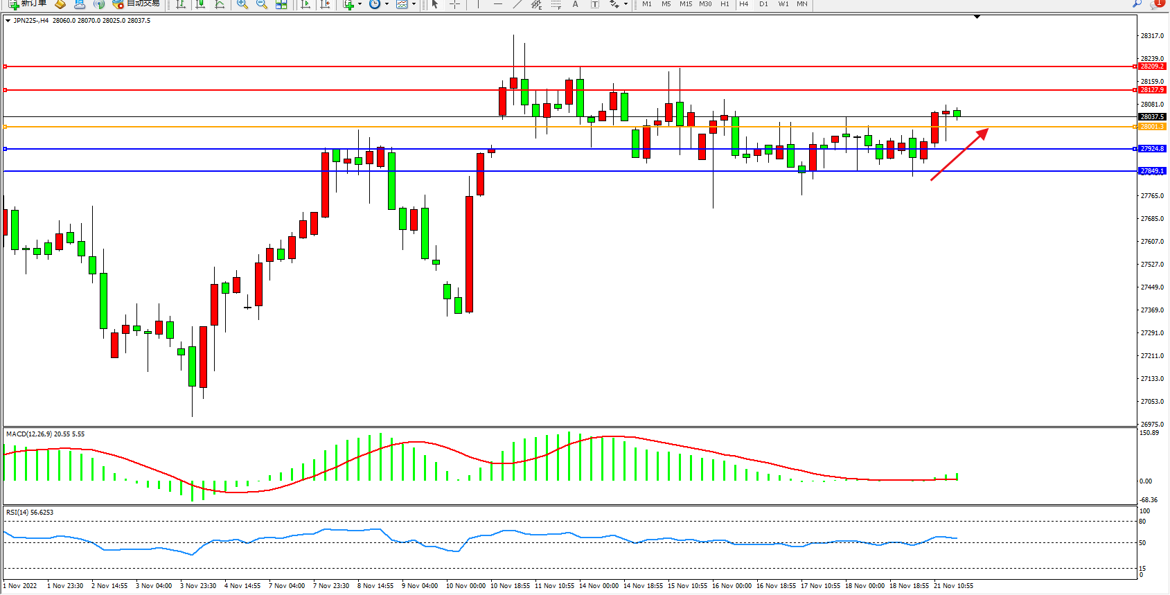 日经指数JPN225——4小时K线图显示: