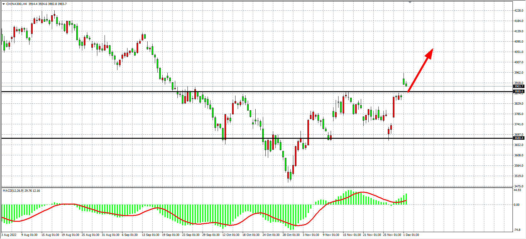 4小时图看,沪深3000高开低走,但仍在3880支撑之上运行,MACD量能柱在零轴之上持续放量,日内在3880之上有望延续涨势,上方关注关注4000关口附近,上破看至更高。