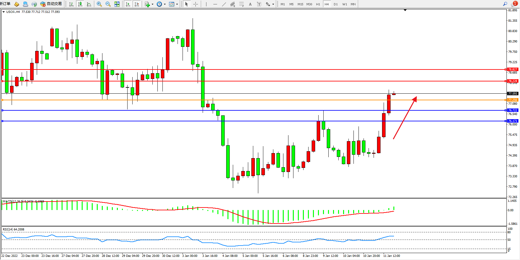 交易策略:77.256上方看涨,目标78.228、78.827