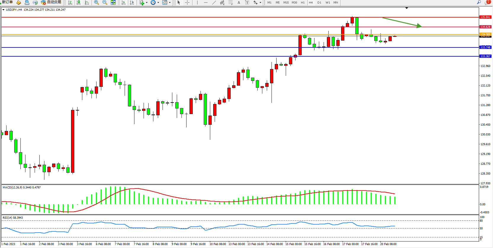 交易策略:134.306下方看跌,目标133.748、133.367