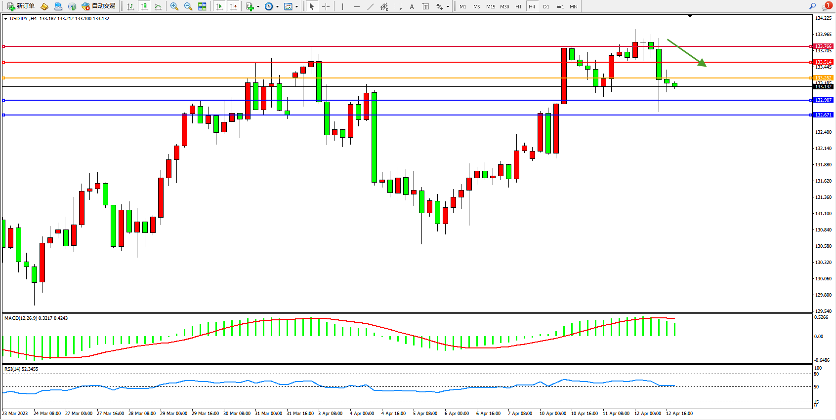 交易策略:133.262下方看跌,目标133.514 133.766