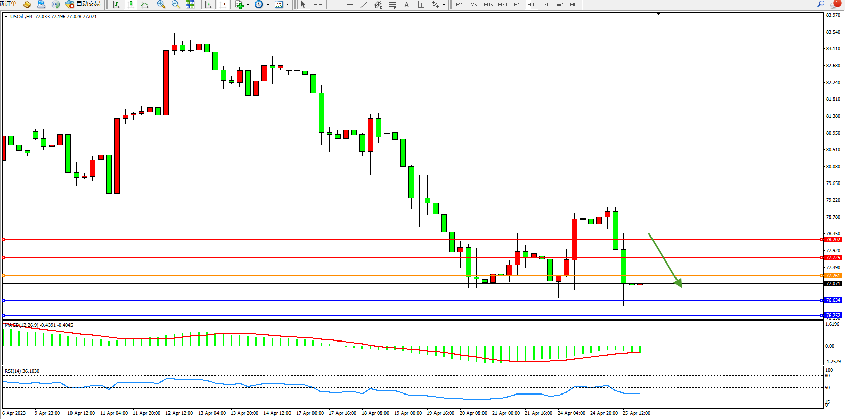 交易策略:77.261下方看跌,目标76.534  76.252
