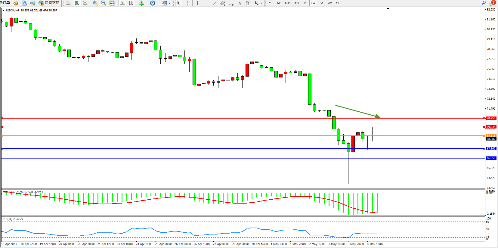 交易策略:68.918下方看跌,目标67.560 66.550