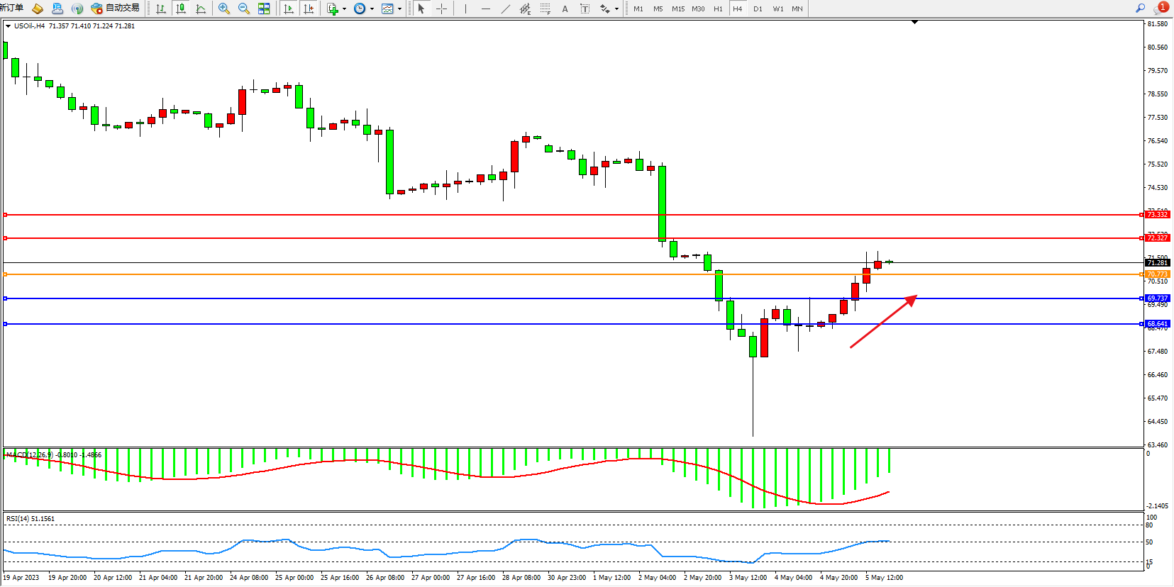 原油USOil——4小时K线图显示: