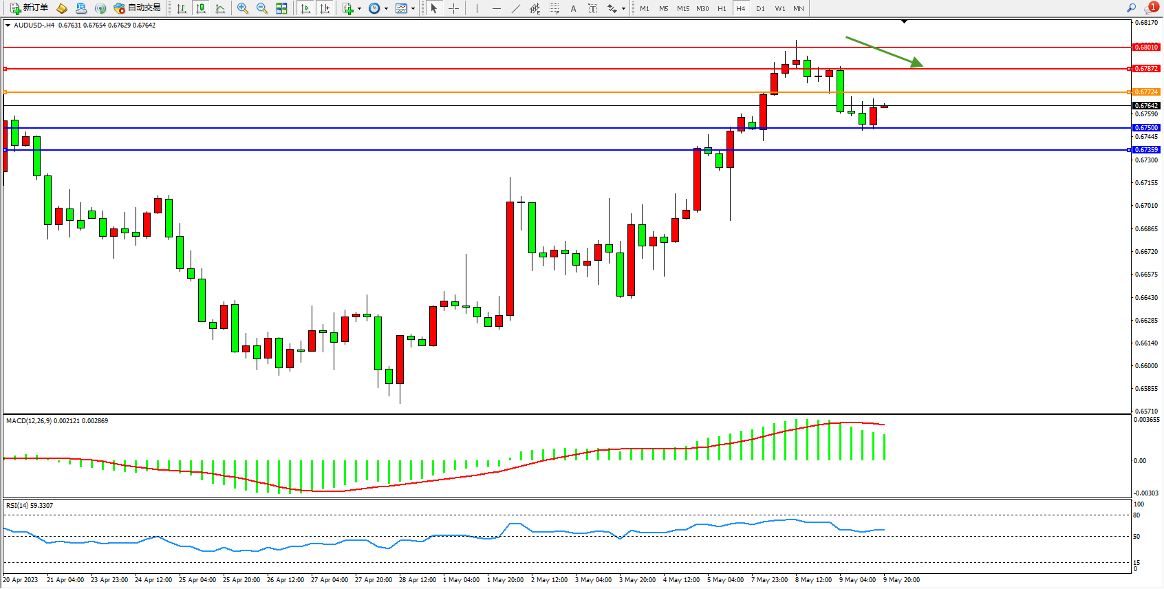 交易策略:0.67724下方看跌,目标0.67500  0.67359