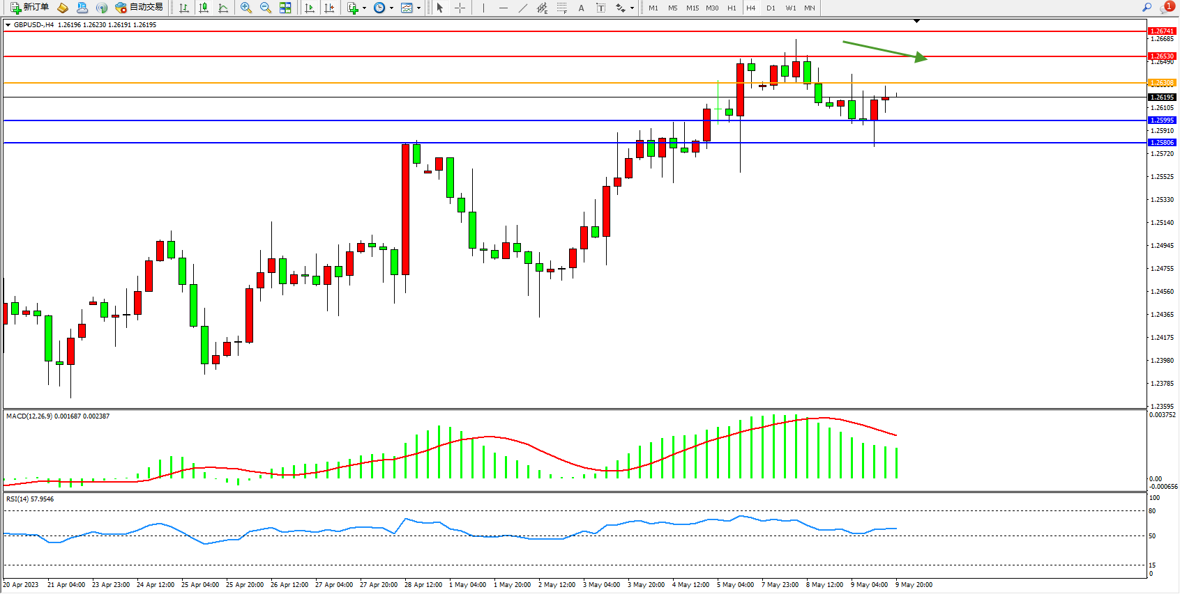 备选策略:1.26308上方看涨,目标1.26530  1.26741