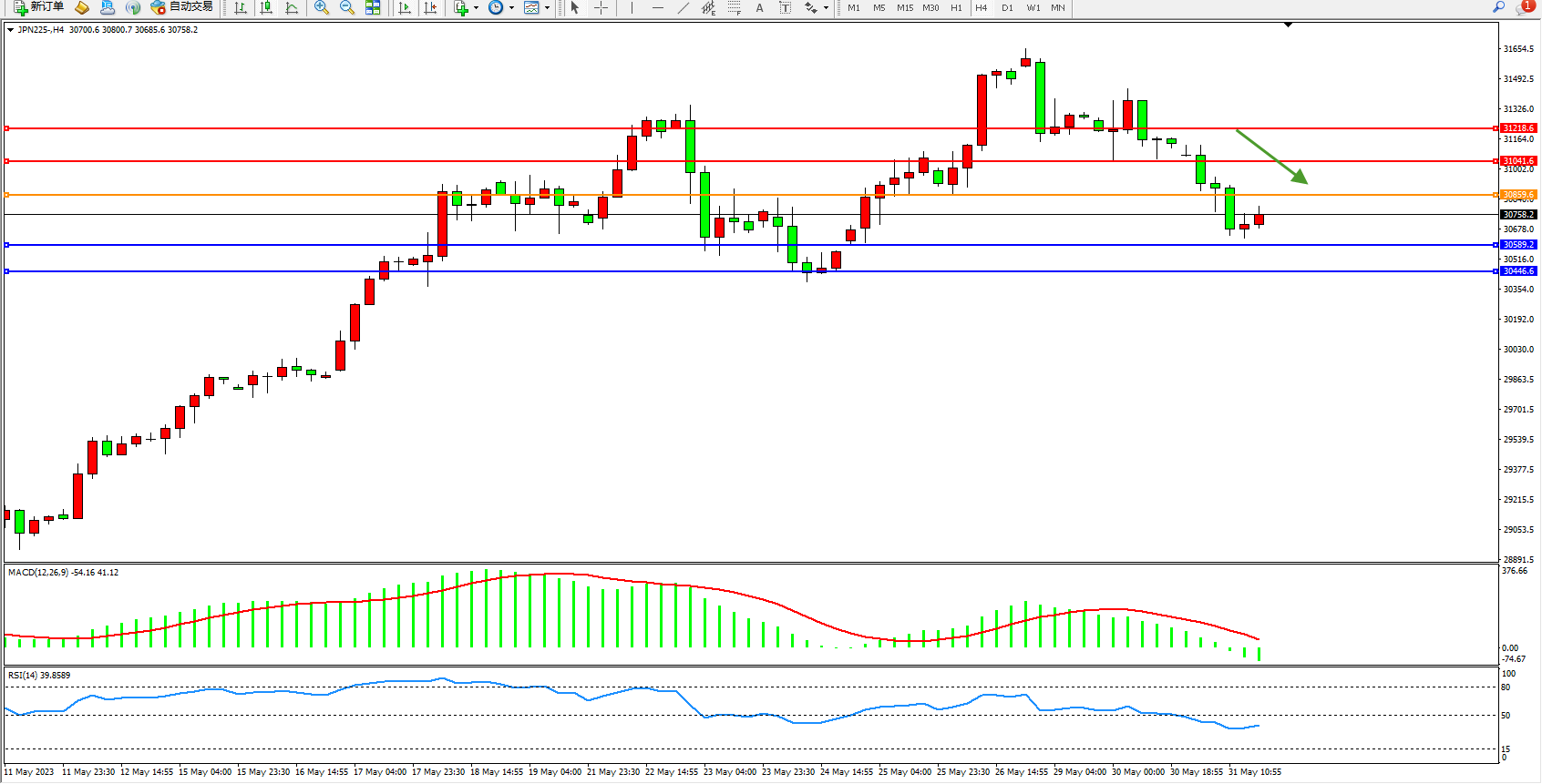 日经指数JPN225——4小时K线图显示:
