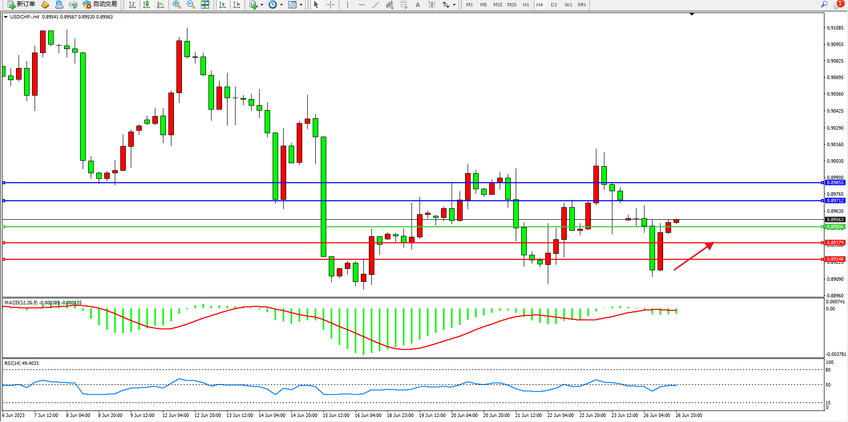 美元瑞郎USDCHF——4小时K线图显示: