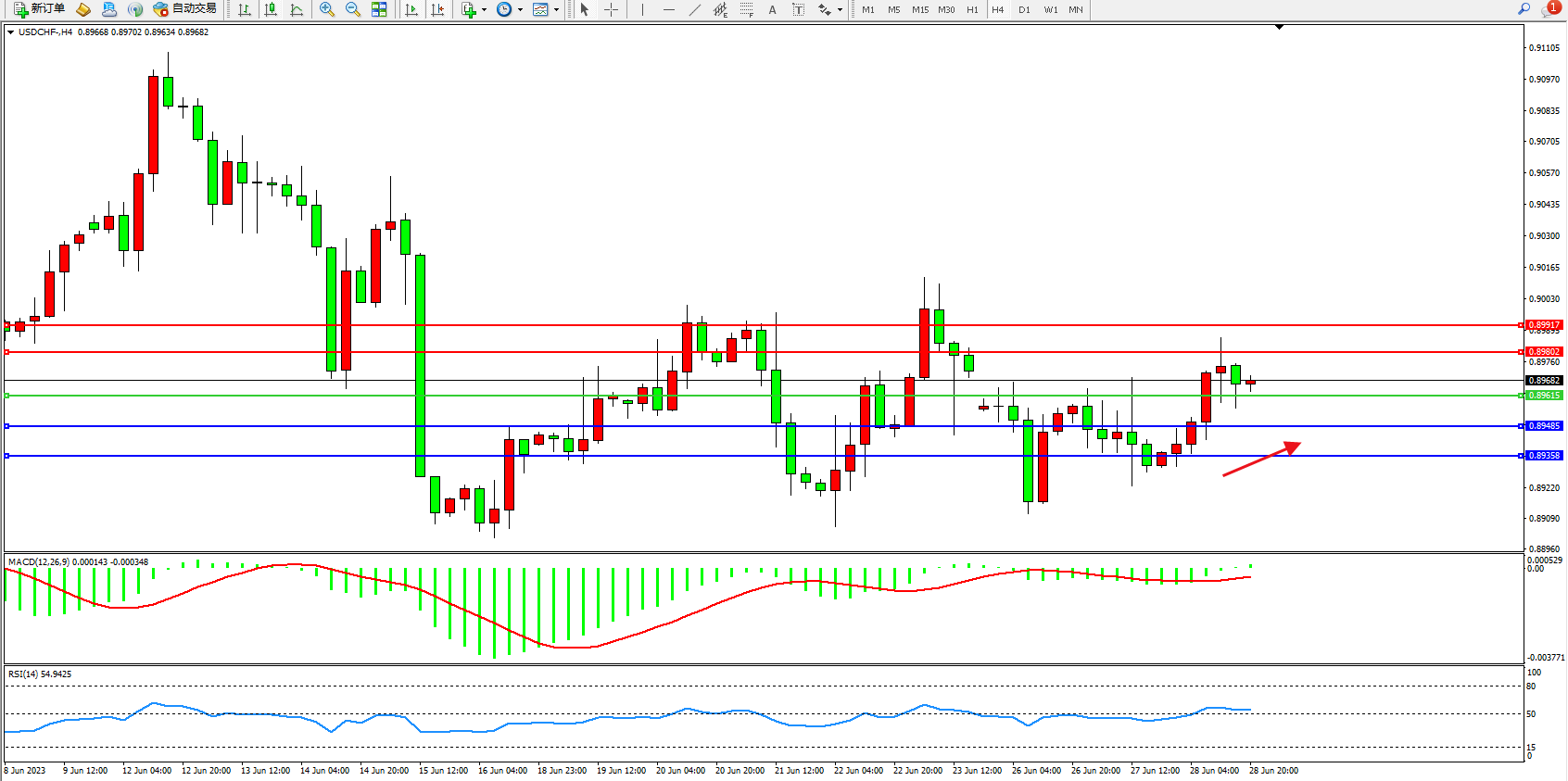美元瑞郎USDCHF——4小时K线图显示: