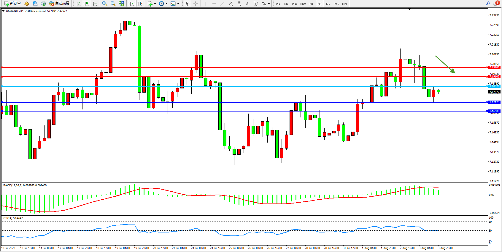 交易策略:7.18370下方看跌,目标7.17173  7.16508