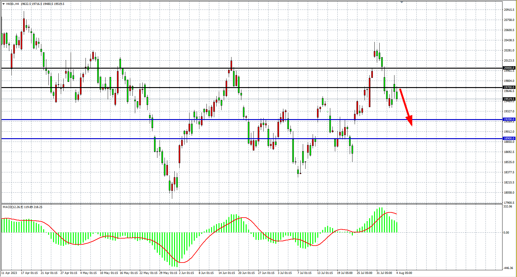 4小时图看,恒指冲高回落,维持19700下走低,MACD量能在零轴上缩减,阻力关注19700,该位之下看19200-18900附近。