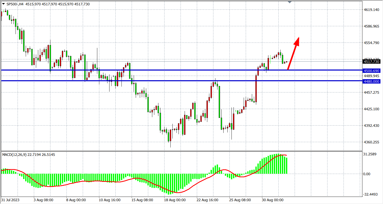 4小时图看,标普虽有所回落但仍维持在4500之上,MACD量能维持在零轴上,行情多头格局不变,继续支撑关注450-44800附近,上方阻力看4550-4580。