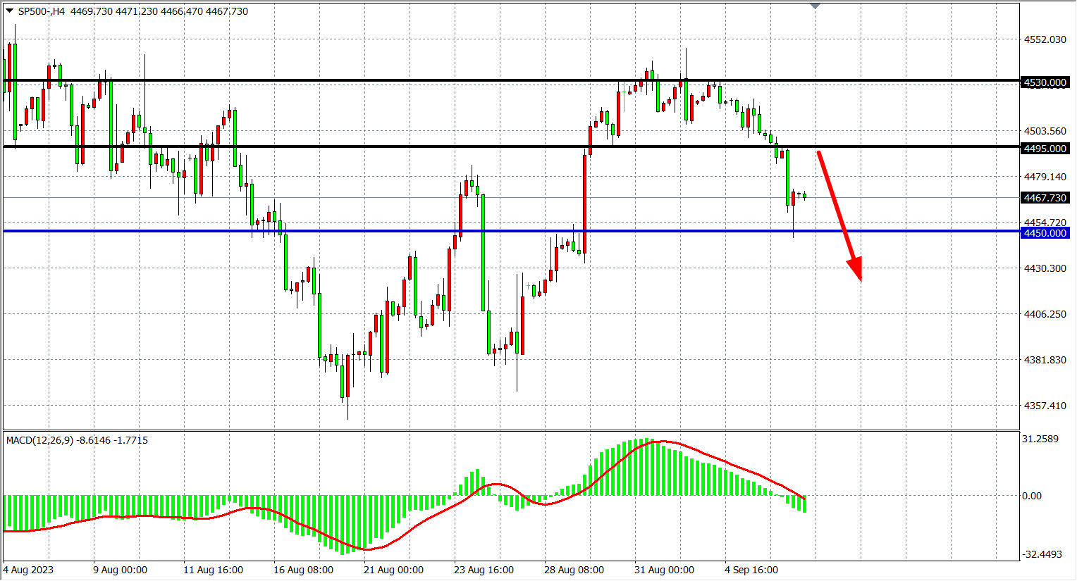 4小时图看,标普继续下跌至4450附近,MACD量能在零轴下,行情延续走空,阻力关注4495-4530附近,下方支撑看4450-4420。
