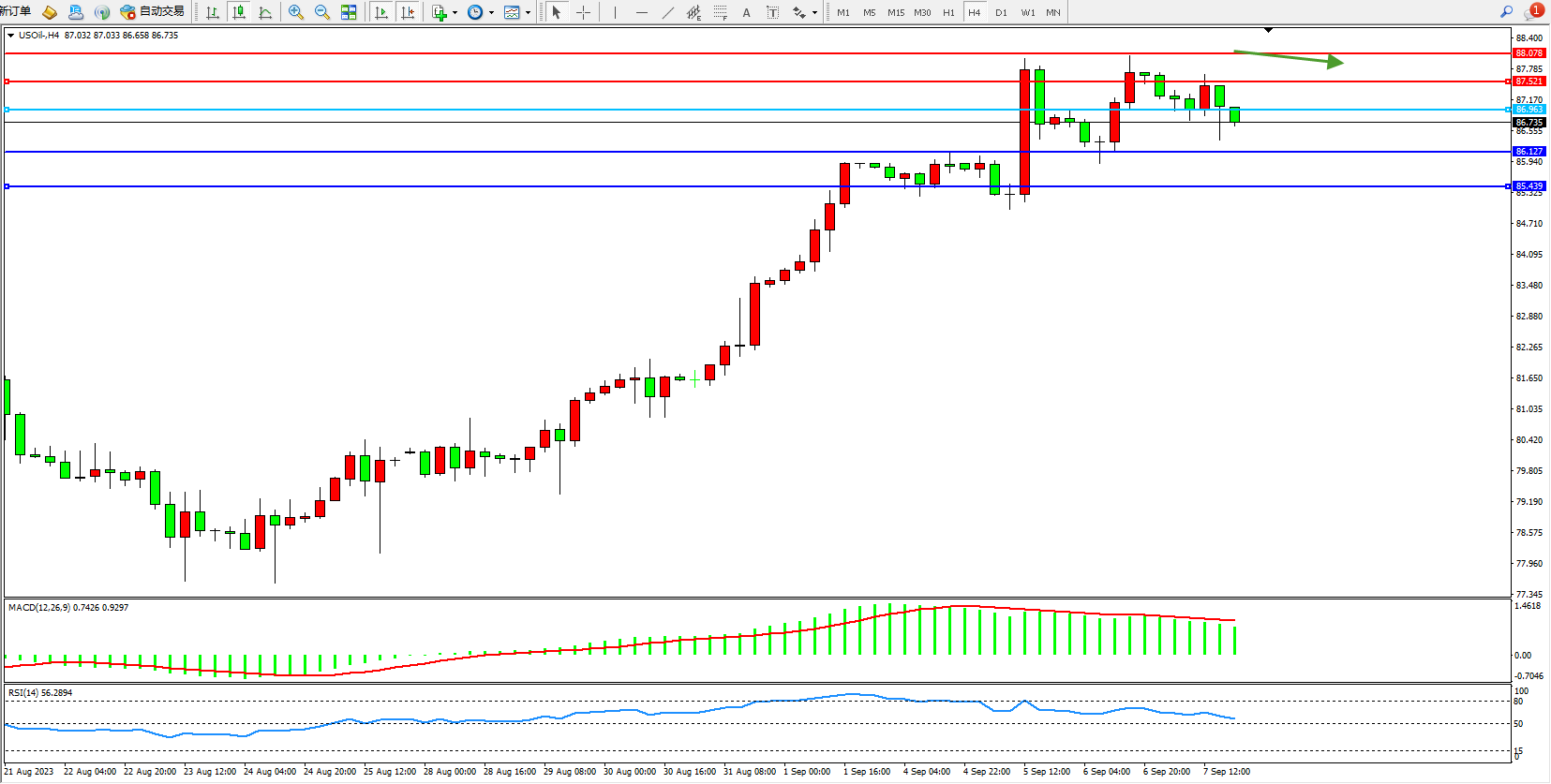 原油USOil——4小时K线图显示: