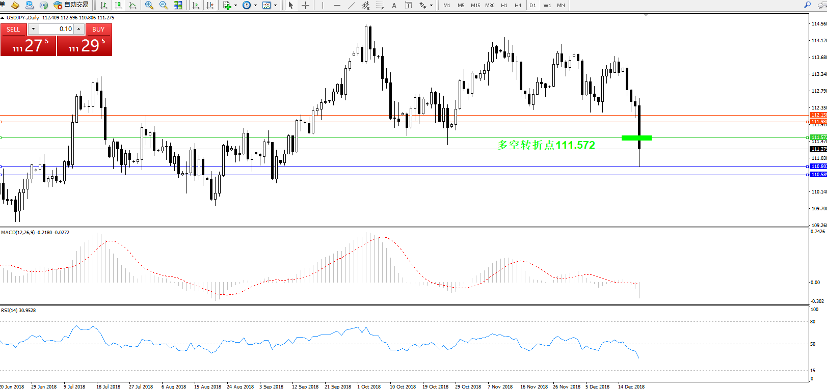 交易策略:111.572下方看跌,目标110.80110.58