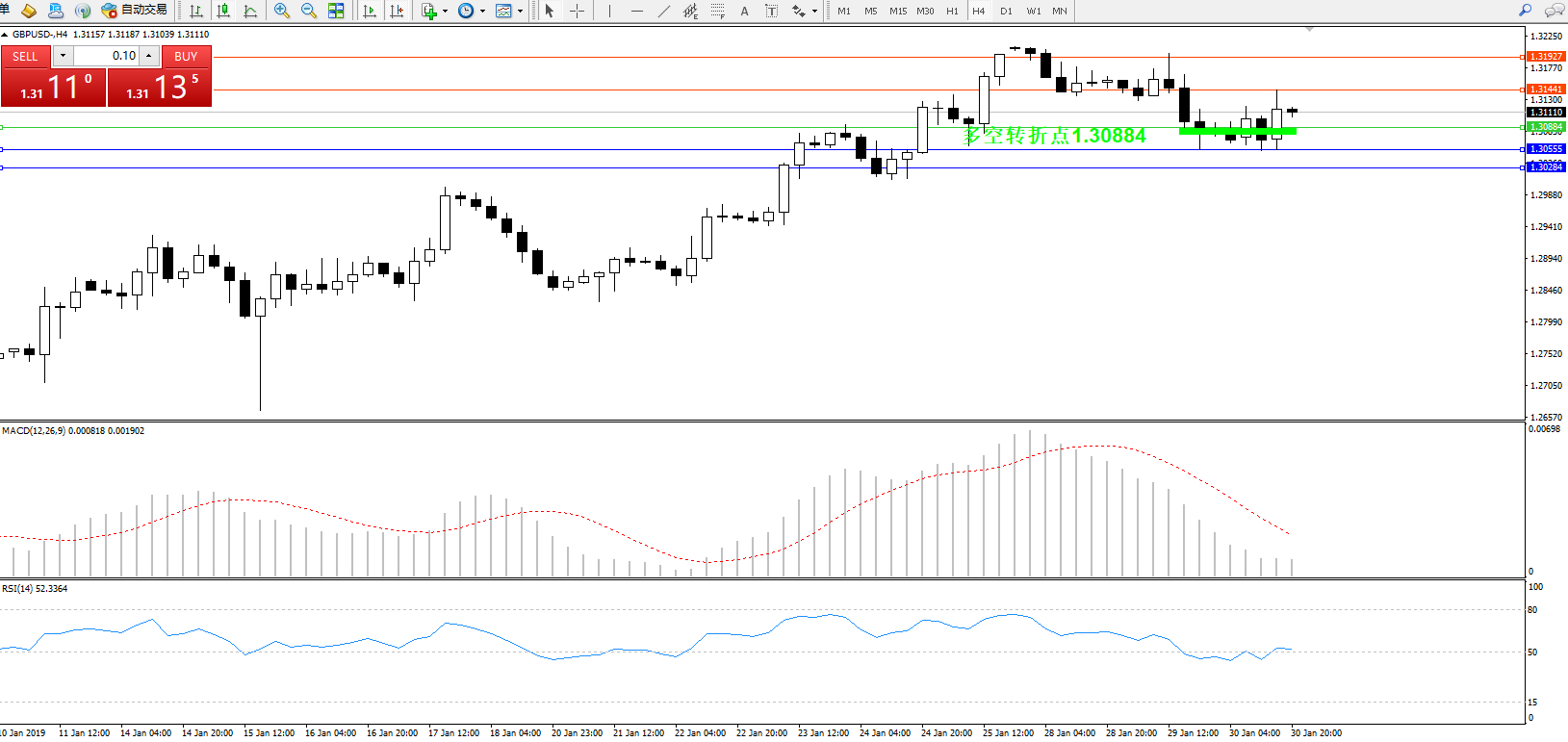 交易策略:1.30884上方看涨,目标1.31441、1.31927