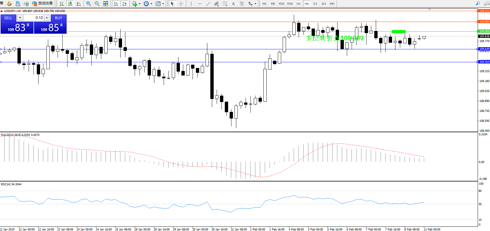 交易策略:109.909下方看跌,目标109.649109.459