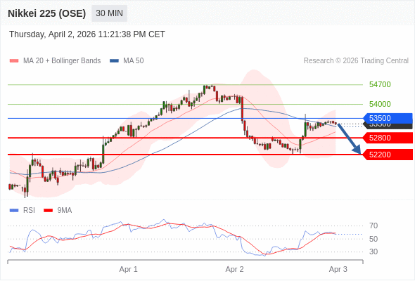 在 53500 之下,看跌,目标价位为 52800 ,然后为 52200 。