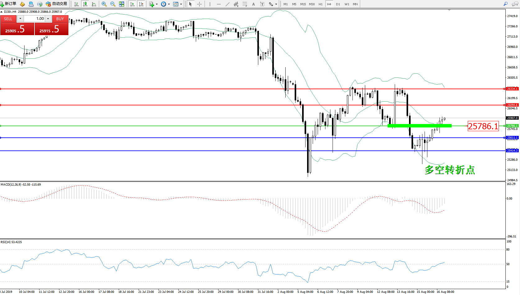 技术点评:空头震荡下行触及布林带下轨得到支撑持续整理缓慢回升突破中轨附近压制进入中上轨区间震荡,有继续上扬态势,宽幅震荡走势持续,MACD指标空头区域缓慢回升至0轴下方,空头动力有所减弱,多头入场,RSI指标突破50均衡线进入多头区域徘徊;