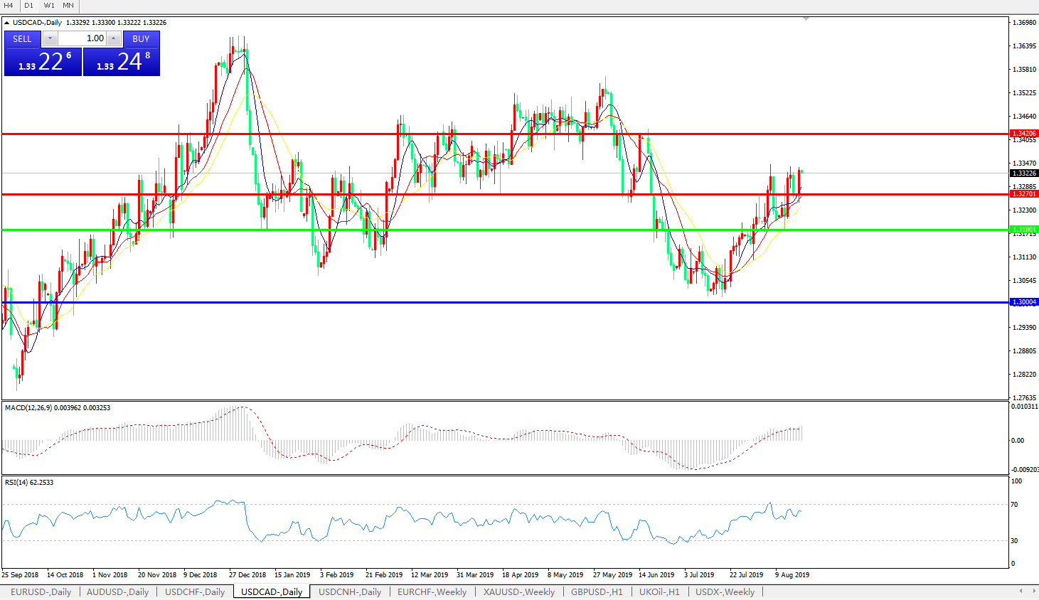 技术面简析:日线图均线整体呈发散上攻态势,汇价昨日强势上攻再度触及近期高点,MACD运行于0轴上方且动能柱量能维持,RSI呈整理震荡态势有上行倾向,预计汇价短期汇价料将进一步上行,试探1.34附近压制。