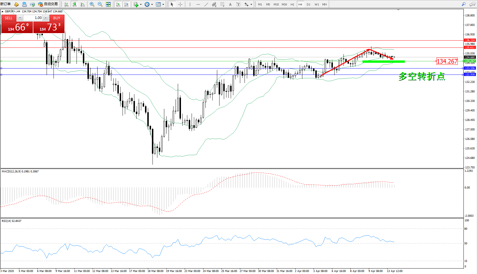 交易策略:134.267上方看涨,目标135.611、136.334