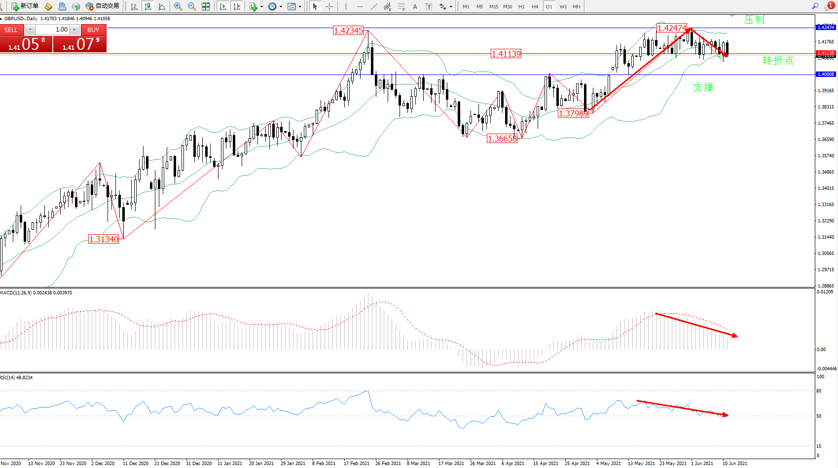多头动力延续布尔带指标通道中上轨区间持续震荡上扬,高位抵达1.42474附近节点后维持弱势整理中,高位布尔带指标呈收口平移走势持续中,短期或有维持整理后有破下轨迹象,上方压制关注1.42474附近节点,下方支撑关注1.40008附近节点,关注中轨1.41139附近转折点,MACD指标处于多头区域高位维持整理不断下移中,RSI指标处于多头区域维持在50均衡线上侧弱势整理中,如图: