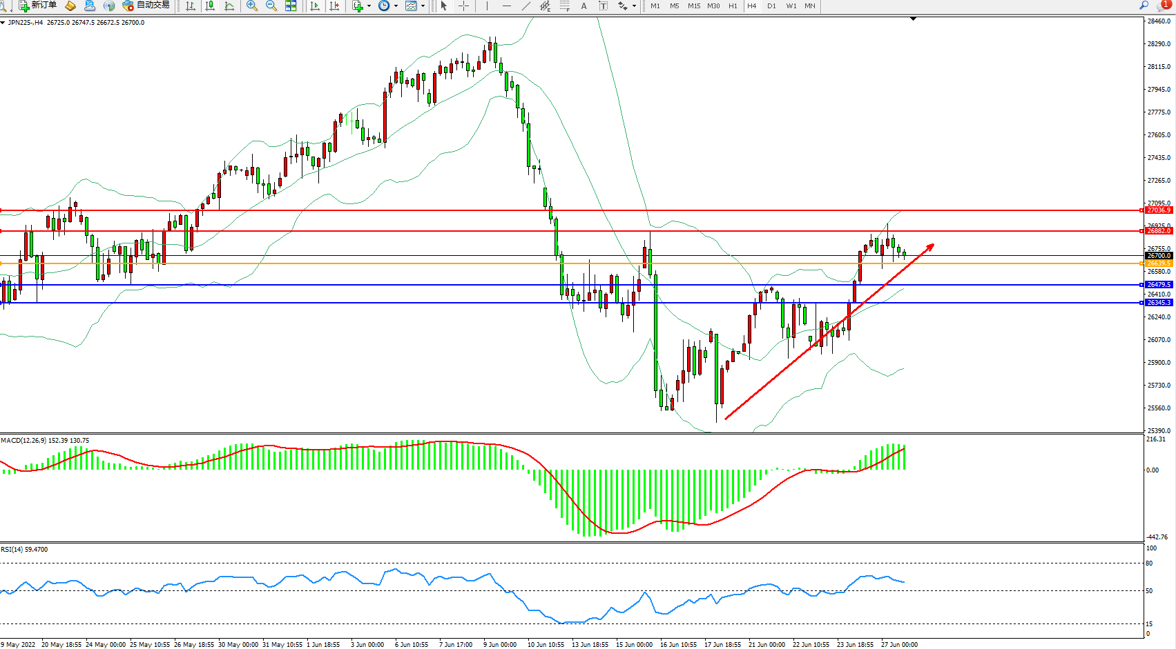 日经指数JPN225——4小时K线图显示:
