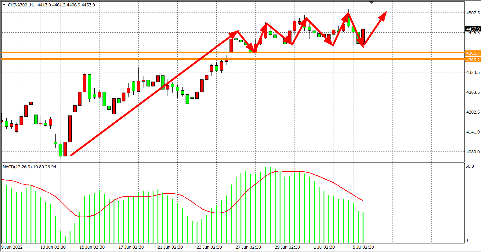 1小时图看,沪深300低开回探4420附近,但仍处于支撑4385之上,MADC量能开始于零轴之上缩短,预示短期或维持调整,但趋势仍处于多头格局,后维持在4385之上继续以看涨为主,目标4500-4600,瞎破4385看跌,目标 4300.00 —4190.00