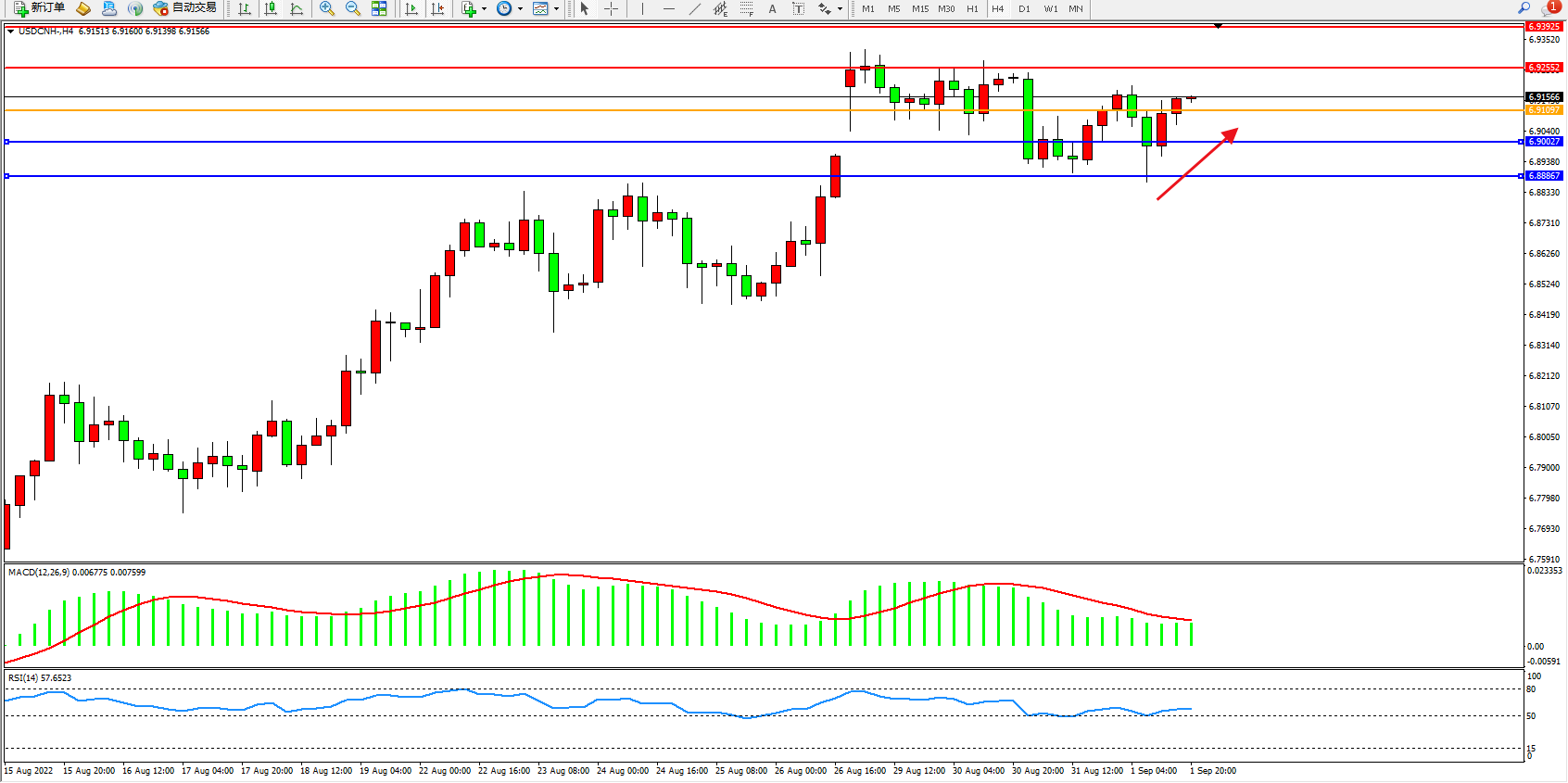 交易策略:6.91097上方看涨,目标6.92552、6.93925