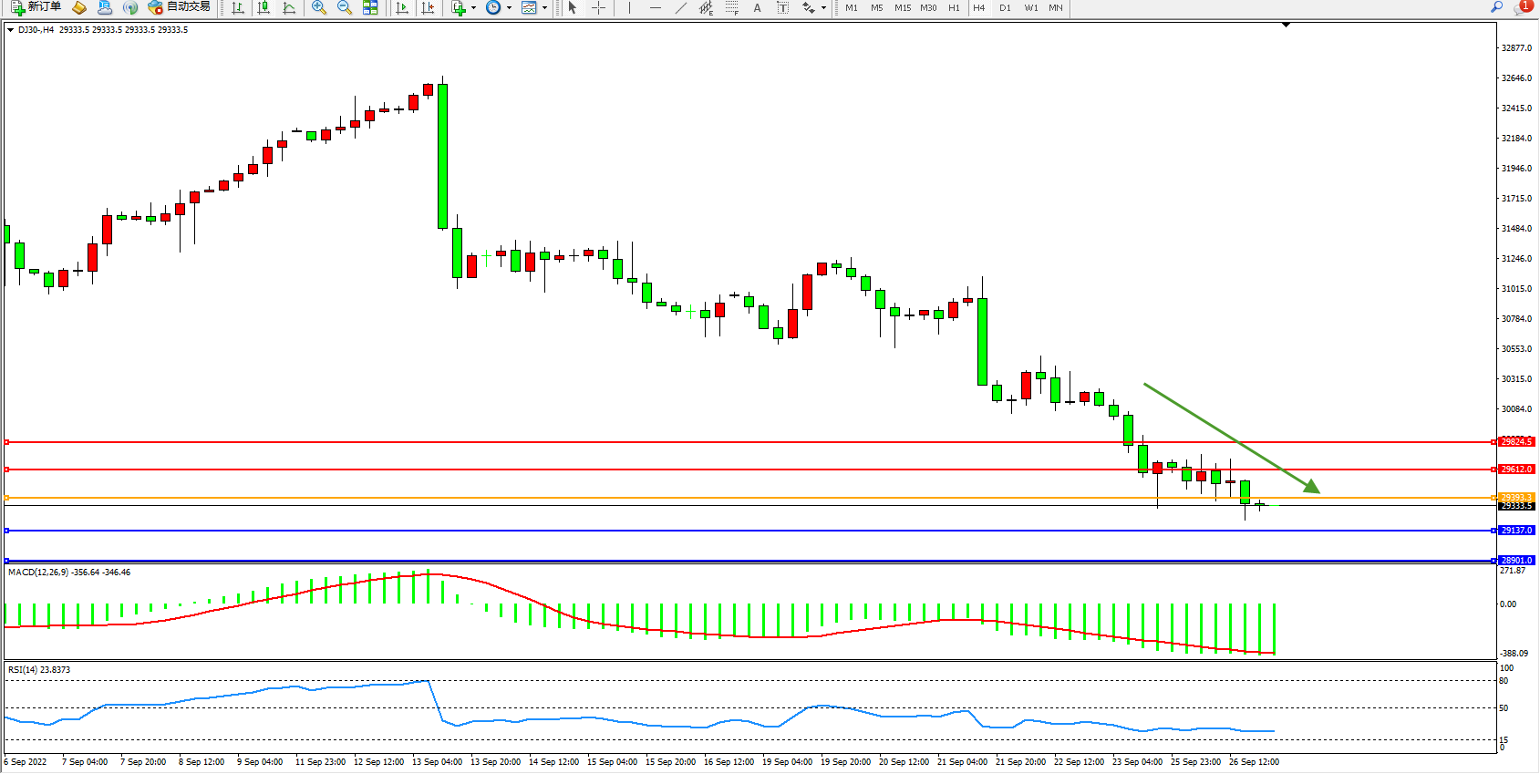 道琼斯指数DJ30——4小时K线图显示: