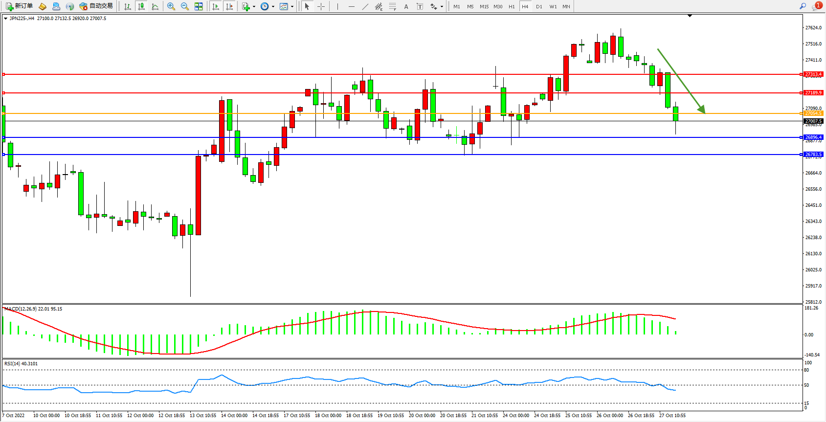 日经指数JPN225——4小时K线图显示: